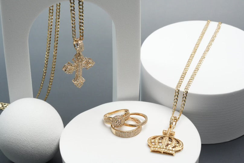 This luxurious collection features a stunning cross pendant with intricate diamond detailing on a stylish Cuban chain, a trio ring set with dazzling diamonds, and a regal crown pendant adorned with diamonds. Each piece is crafted from polished gold, showcasing fine craftsmanship and elegance, making this collection perfect for special occasions or as a statement of sophistication and style. -