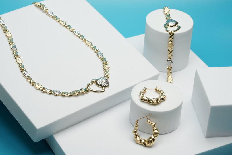 This elegant jewelry set features a two-tone gold necklace and bracelet adorned with ‘X’ and heart motifs, symbolizing hugs and kisses, each embellished with sparkling diamonds. The set is complemented by a pair of intricate yellow gold hoop earrings, adding a touch of sophistication and charm. Perfect for any occasion, this collection combines timeless design with modern elegance, making it an ideal gift or a stunning addition to your own jewelry collection.