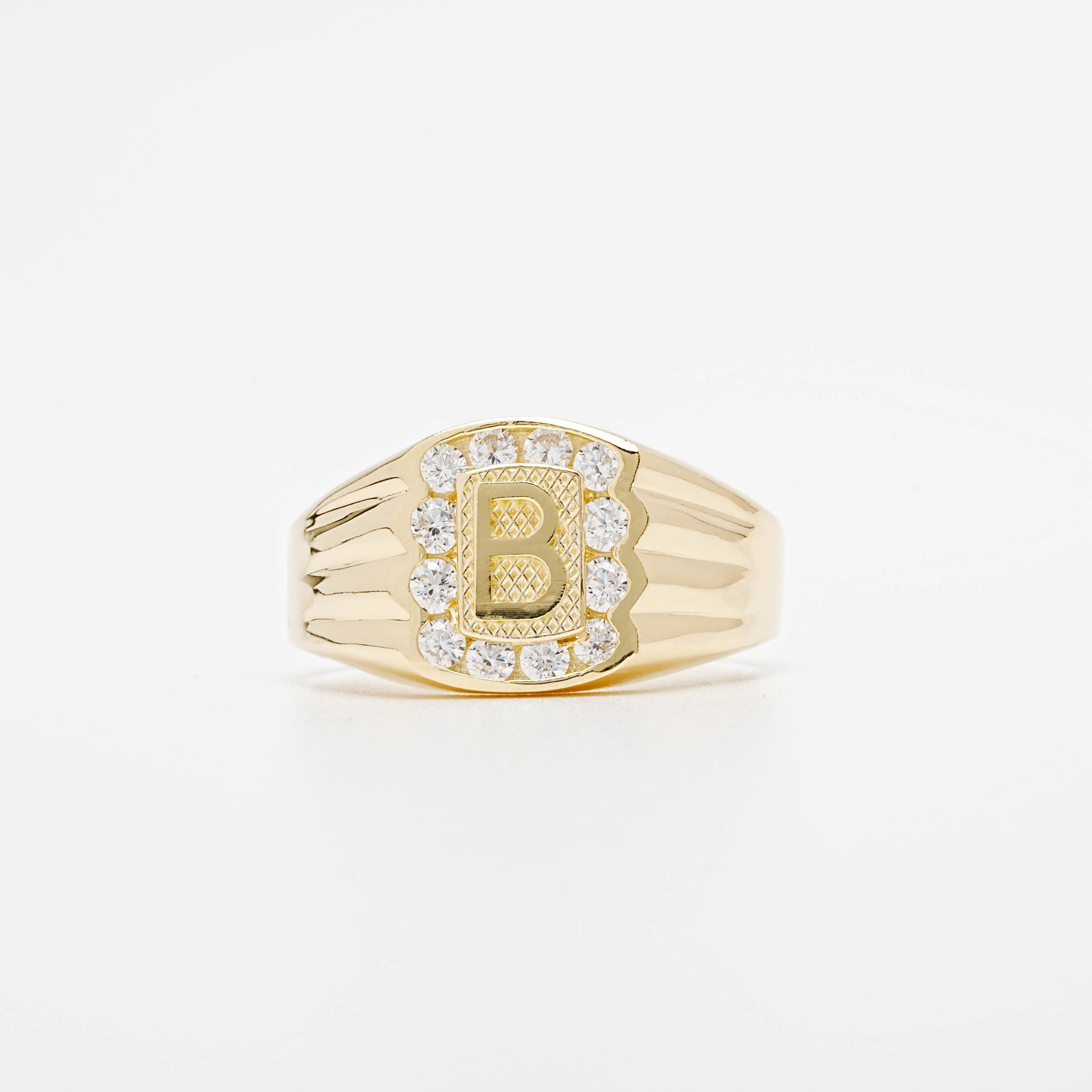 This men's 10K gold ring features a striking initial design adorned with cubic zirconia, offering a blend of luxury and personalization. Ideal for making a bold statement, this ring is perfect for any occasion.
