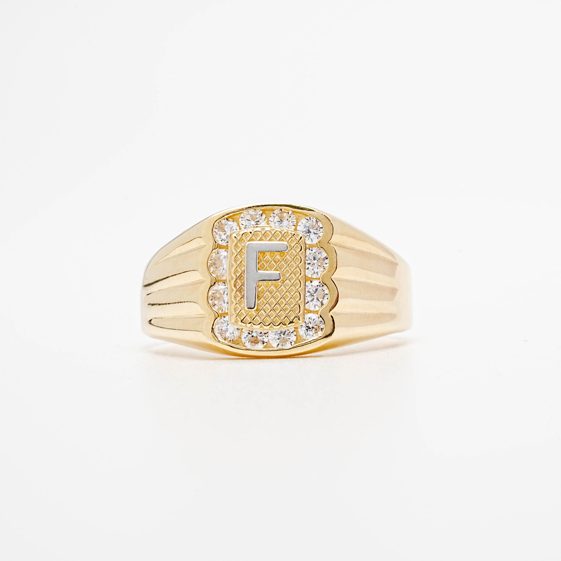This men's 10K gold ring features a striking initial design adorned with cubic zirconia, offering a blend of luxury and personalization. Ideal for making a bold statement, this ring is perfect for any occasion.