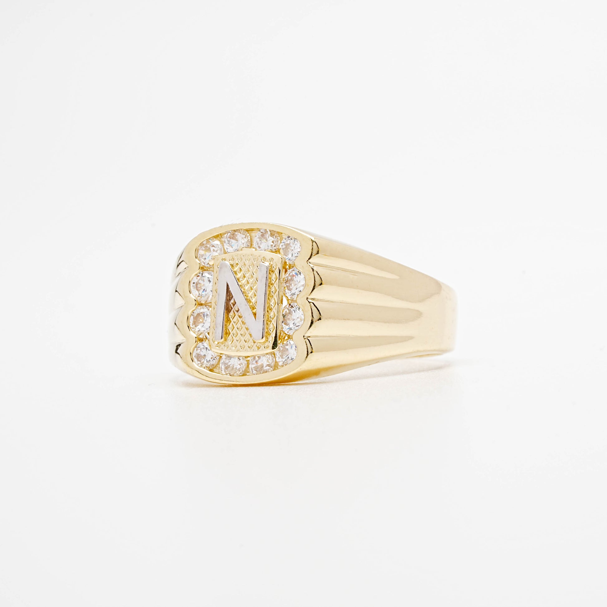 This men's 10K gold ring features a striking initial design adorned with cubic zirconia, offering a blend of luxury and personalization. Ideal for making a bold statement, this ring is perfect for any occasion.