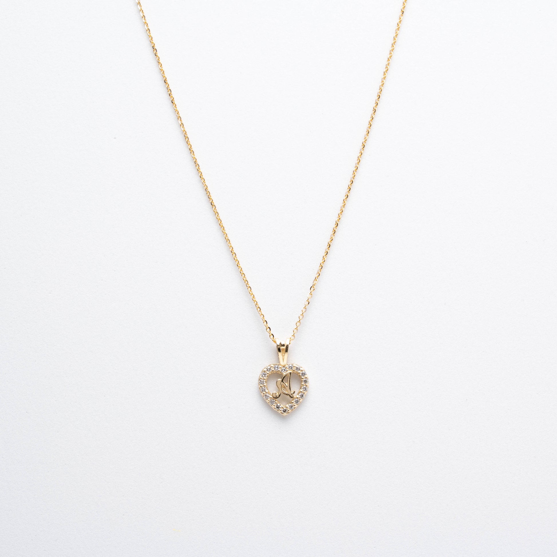 This elegant piece features a heart-shaped pendant adorned with sparkling cubic zirconia for a dazzling effect. Choose your initial to make it uniquely yours. The necklace is displayed with a delicate yet strong solid Rolo chain, available in 16, 18, 20 inches, offering a refined and elegant look. This versatile necklace is perfect for layering or wearing alone, providing endless possibilities for personalization and style. Plus, a matching ring is available in our ring collection to complete your look.