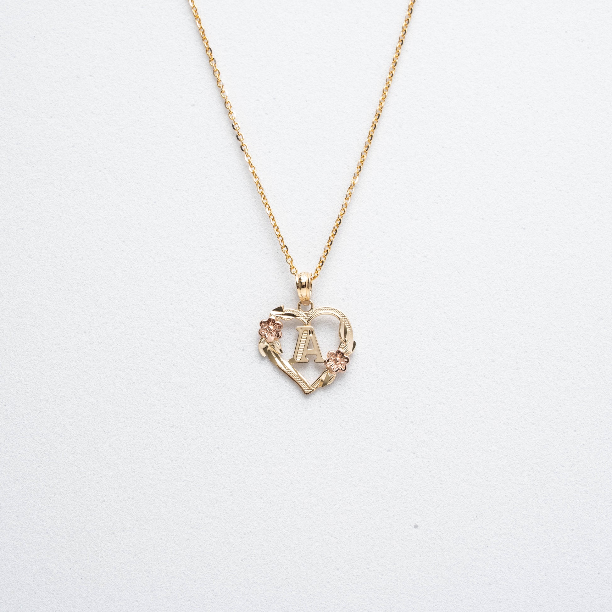 This exquisite piece features a heart-shaped pendant crafted from two-tone gold. The base of the delicate flower detail is in rose gold, while the rest of the pendant is fashioned from yellow gold, creating a beautiful contrast. The pendant showcases an initial of your choice, making it a perfect personalized gift. The necklace is displayed with a sleek and sturdy solid Rolo chain, available in 16, 18, or 20 inches. This necklace is perfect for adding a touch of sophistication to any outfit. Plus, matching ring is available in our ring collection to complete your look.