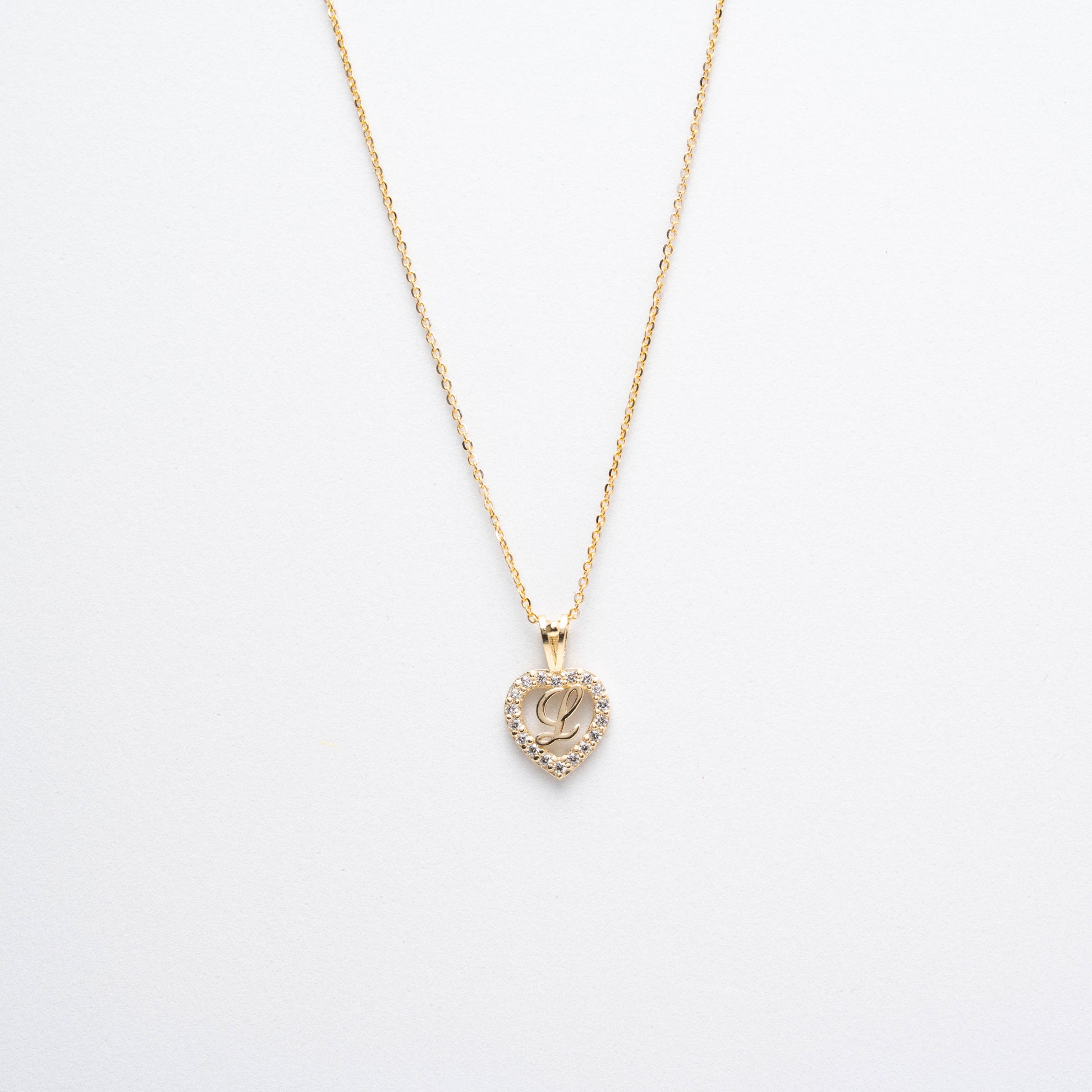 This elegant piece features a heart-shaped pendant adorned with sparkling cubic zirconia for a dazzling effect. Choose your initial to make it uniquely yours. The necklace is displayed with a delicate yet strong solid Rolo chain, available in 16, 18, 20 inches, offering a refined and elegant look. This versatile necklace is perfect for layering or wearing alone, providing endless possibilities for personalization and style. Plus, a matching ring is available in our ring collection to complete your look.