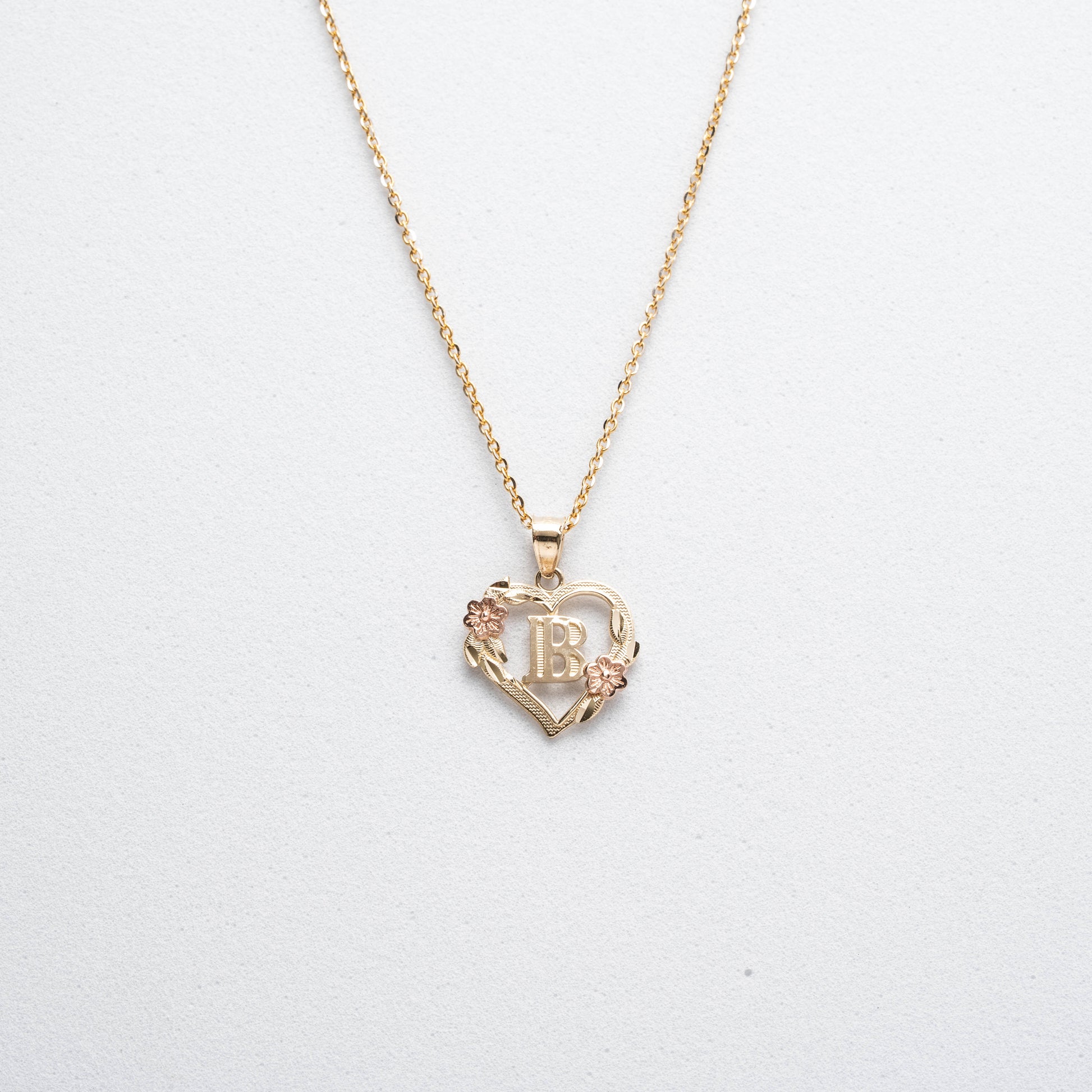 This exquisite piece features a heart-shaped pendant crafted from two-tone gold. The base of the delicate flower detail is in rose gold, while the rest of the pendant is fashioned from yellow gold, creating a beautiful contrast. The pendant showcases an initial of your choice, making it a perfect personalized gift. The necklace is displayed with a sleek and sturdy solid Rolo chain, available in 16, 18, or 20 inches. This necklace is perfect for adding a touch of sophistication to any outfit. Plus, matching ring is available in our ring collection to complete your look.