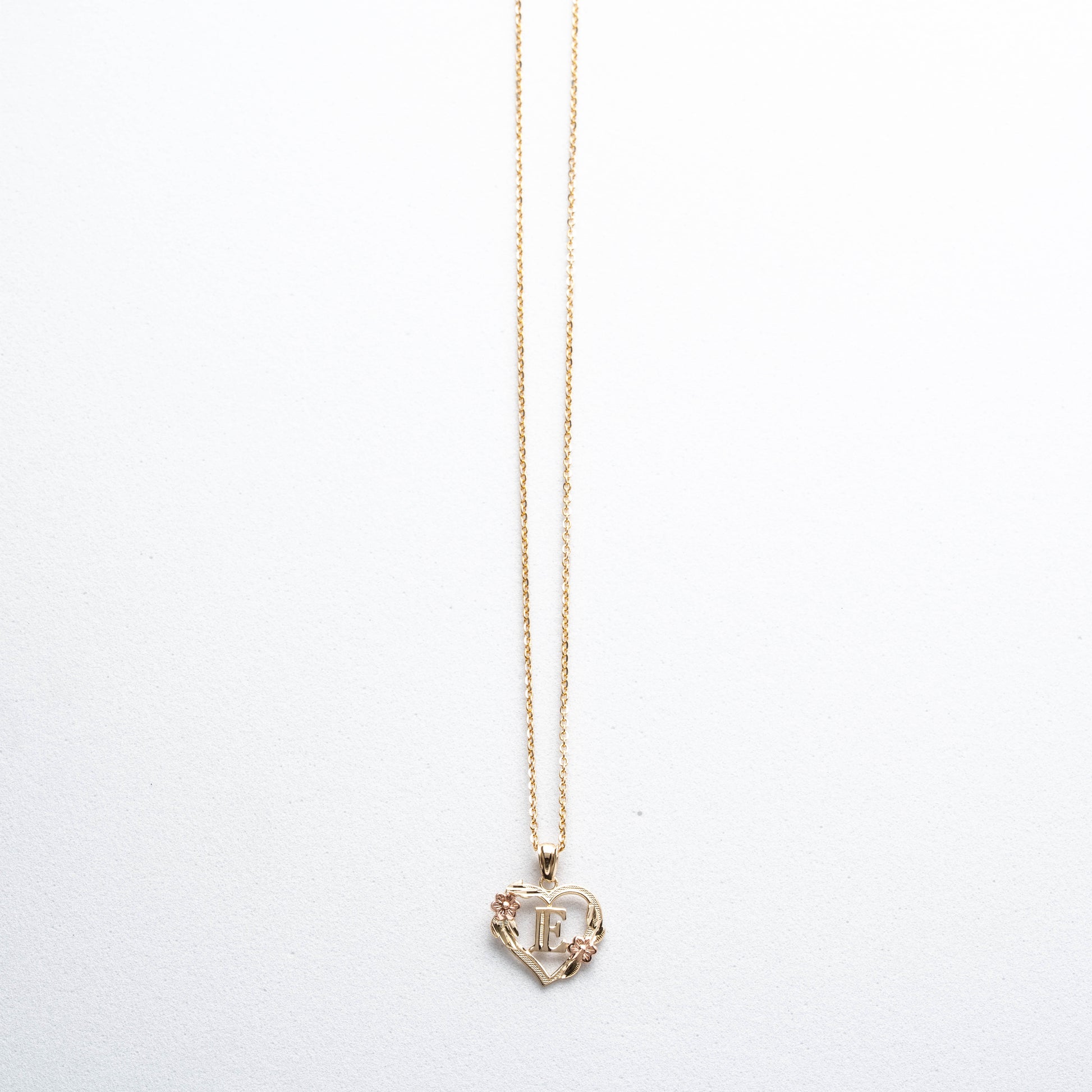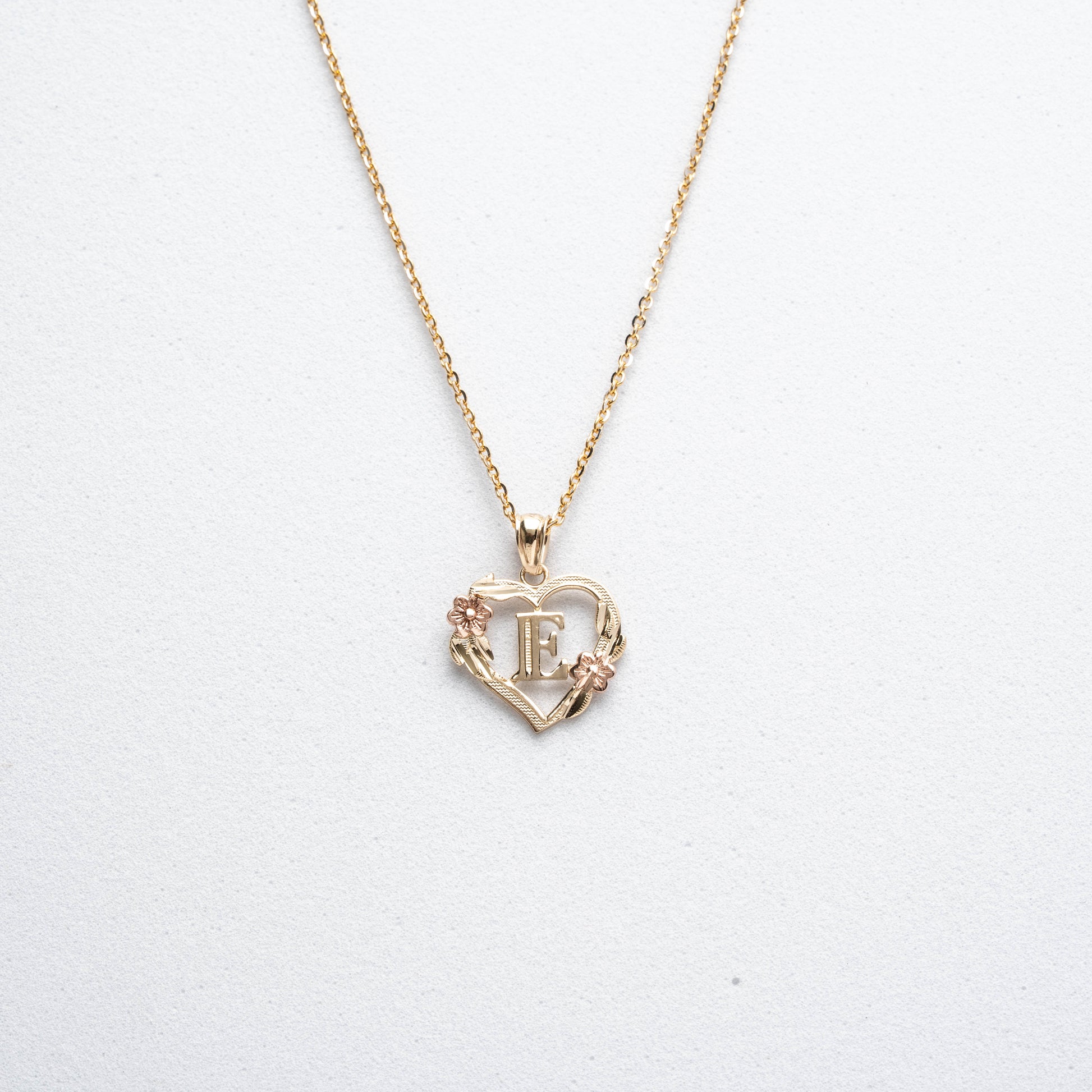 This exquisite piece features a heart-shaped pendant crafted from two-tone gold. The base of the delicate flower detail is in rose gold, while the rest of the pendant is fashioned from yellow gold, creating a beautiful contrast. The pendant showcases an initial of your choice, making it a perfect personalized gift. The necklace is displayed with a sleek and sturdy solid Rolo chain, available in 16, 18, or 20 inches. This necklace is perfect for adding a touch of sophistication to any outfit. Plus, matching ring is available in our ring collection to complete your look.