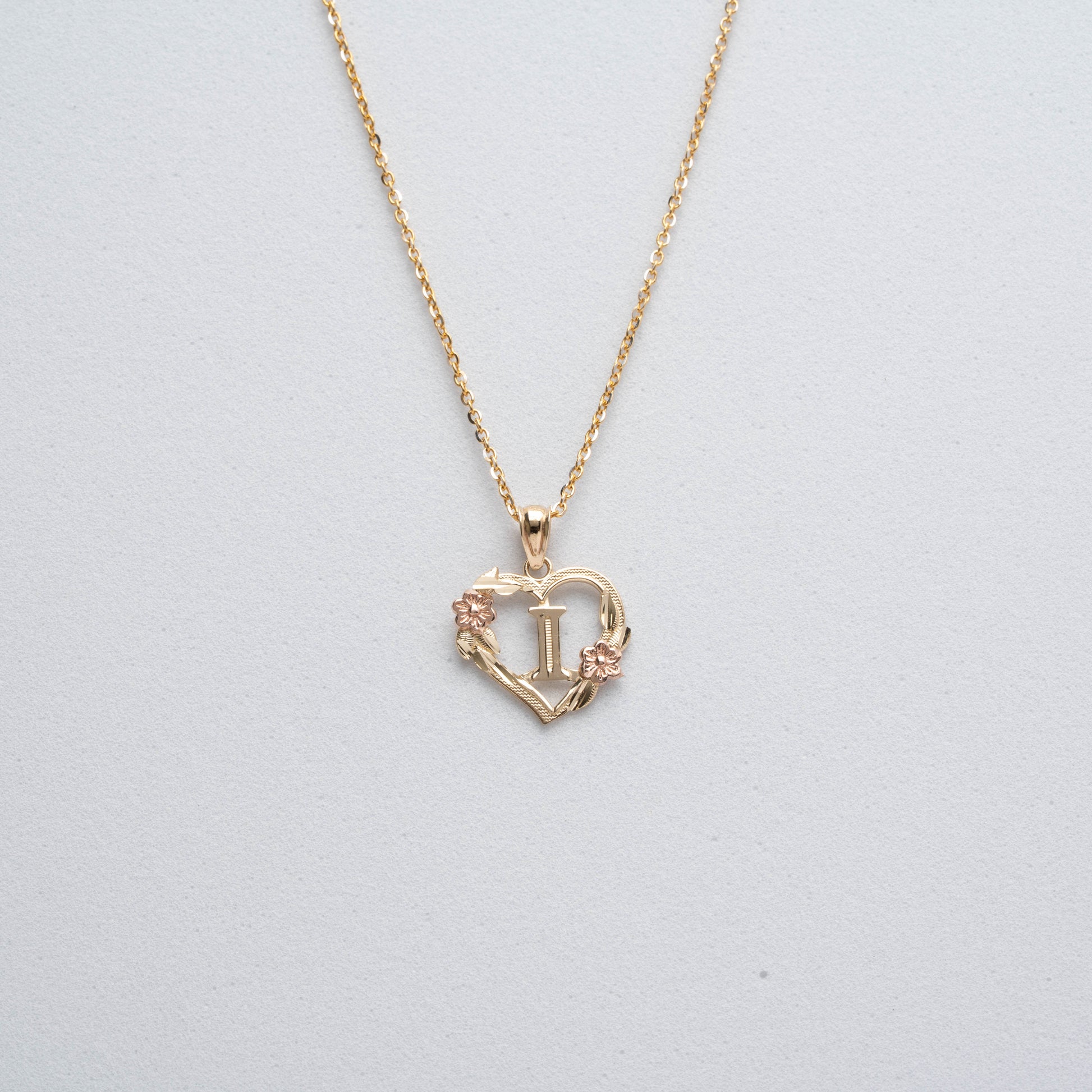 This exquisite piece features a heart-shaped pendant crafted from two-tone gold. The base of the delicate flower detail is in rose gold, while the rest of the pendant is fashioned from yellow gold, creating a beautiful contrast. The pendant showcases an initial of your choice, making it a perfect personalized gift. The necklace is displayed with a sleek and sturdy solid Rolo chain, available in 16, 18, or 20 inches. This necklace is perfect for adding a touch of sophistication to any outfit. Plus, matching ring is available in our ring collection to complete your look.