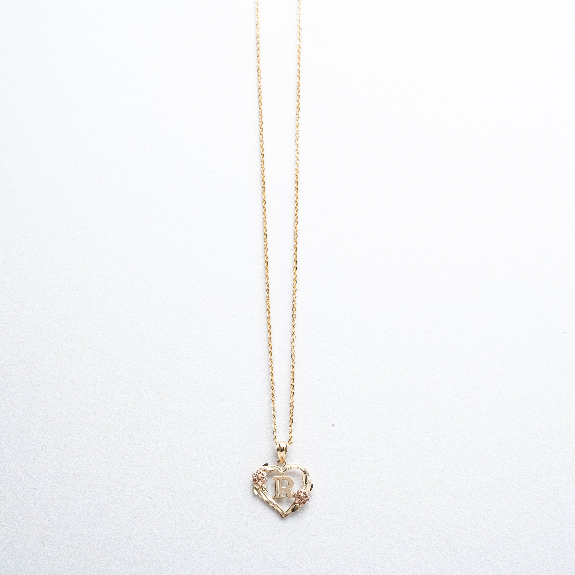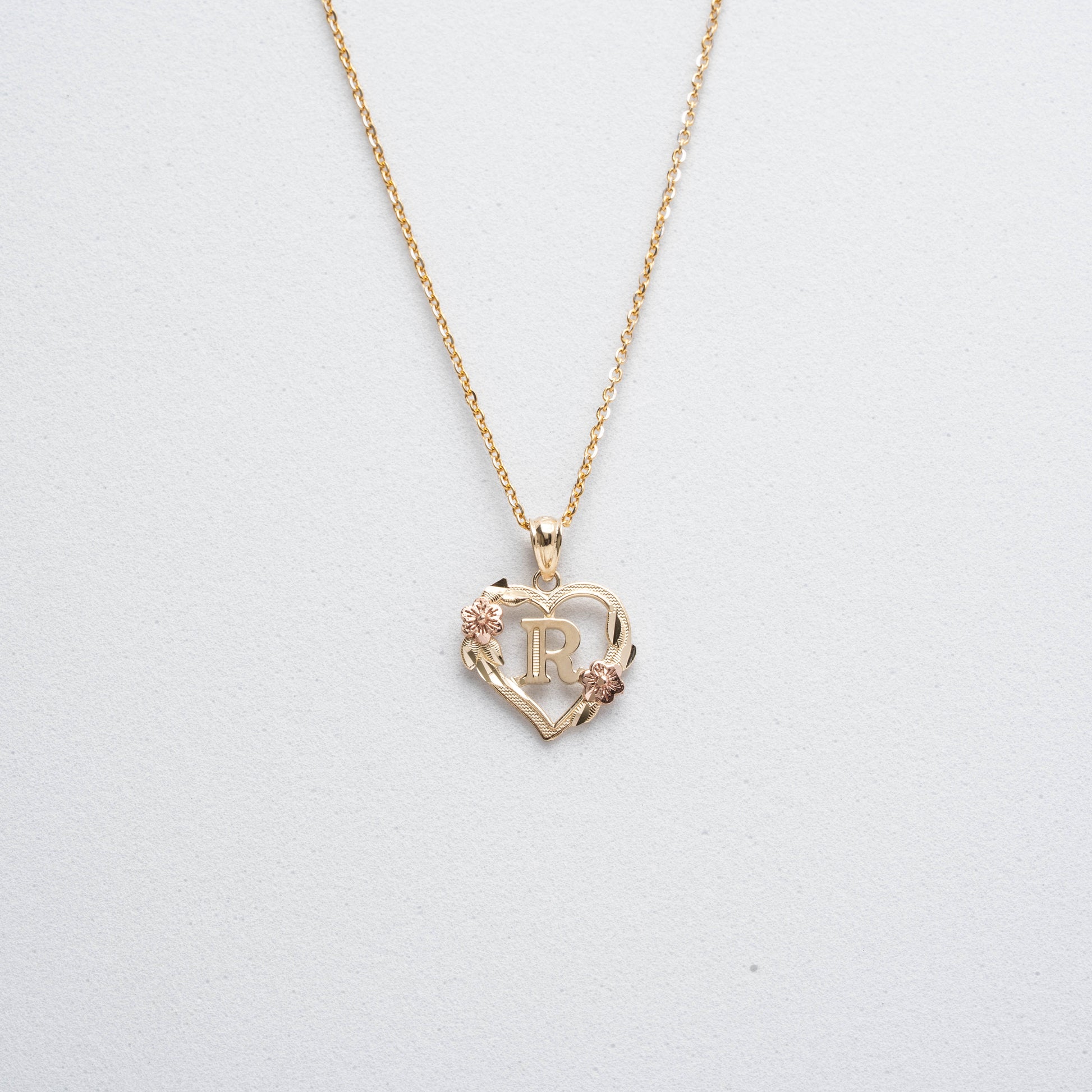 This exquisite piece features a heart-shaped pendant crafted from two-tone gold. The base of the delicate flower detail is in rose gold, while the rest of the pendant is fashioned from yellow gold, creating a beautiful contrast. The pendant showcases an initial of your choice, making it a perfect personalized gift. The necklace is displayed with a sleek and sturdy solid Rolo chain, available in 16, 18, or 20 inches. This necklace is perfect for adding a touch of sophistication to any outfit. Plus, matching ring is available in our ring collection to complete your look.