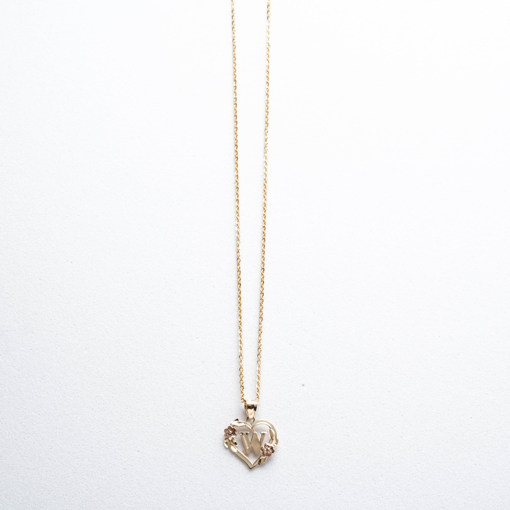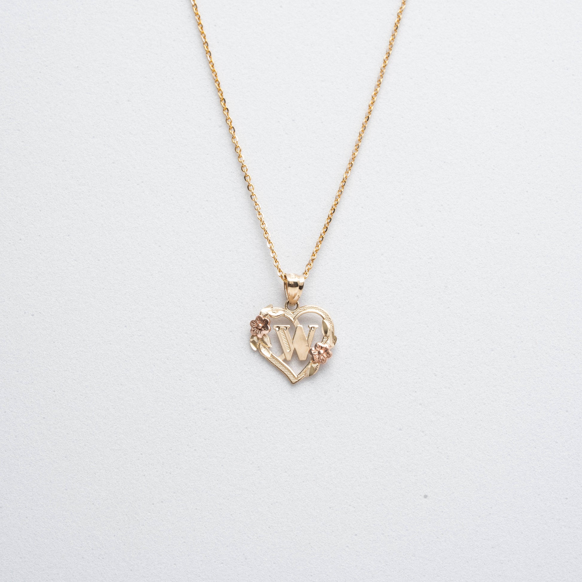 This exquisite piece features a heart-shaped pendant crafted from two-tone gold. The base of the delicate flower detail is in rose gold, while the rest of the pendant is fashioned from yellow gold, creating a beautiful contrast. The pendant showcases an initial of your choice, making it a perfect personalized gift. The necklace is displayed with a sleek and sturdy solid Rolo chain, available in 16, 18, or 20 inches. This necklace is perfect for adding a touch of sophistication to any outfit. Plus, matching ring is available in our ring collection to complete your look.