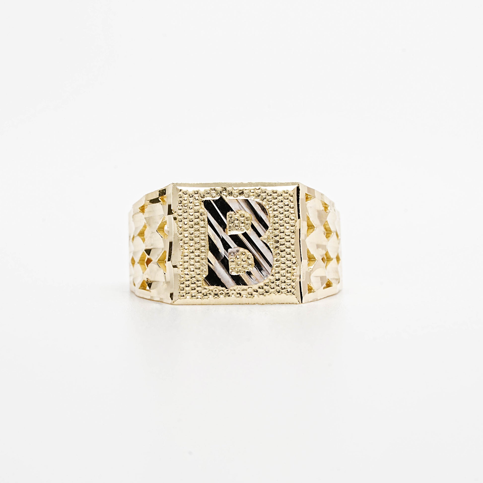 This men's 10K gold ring features a striking two-tone design with a diamond-cut finish and an engraved initial. Perfect for adding a touch of personalized elegance to any outfit.