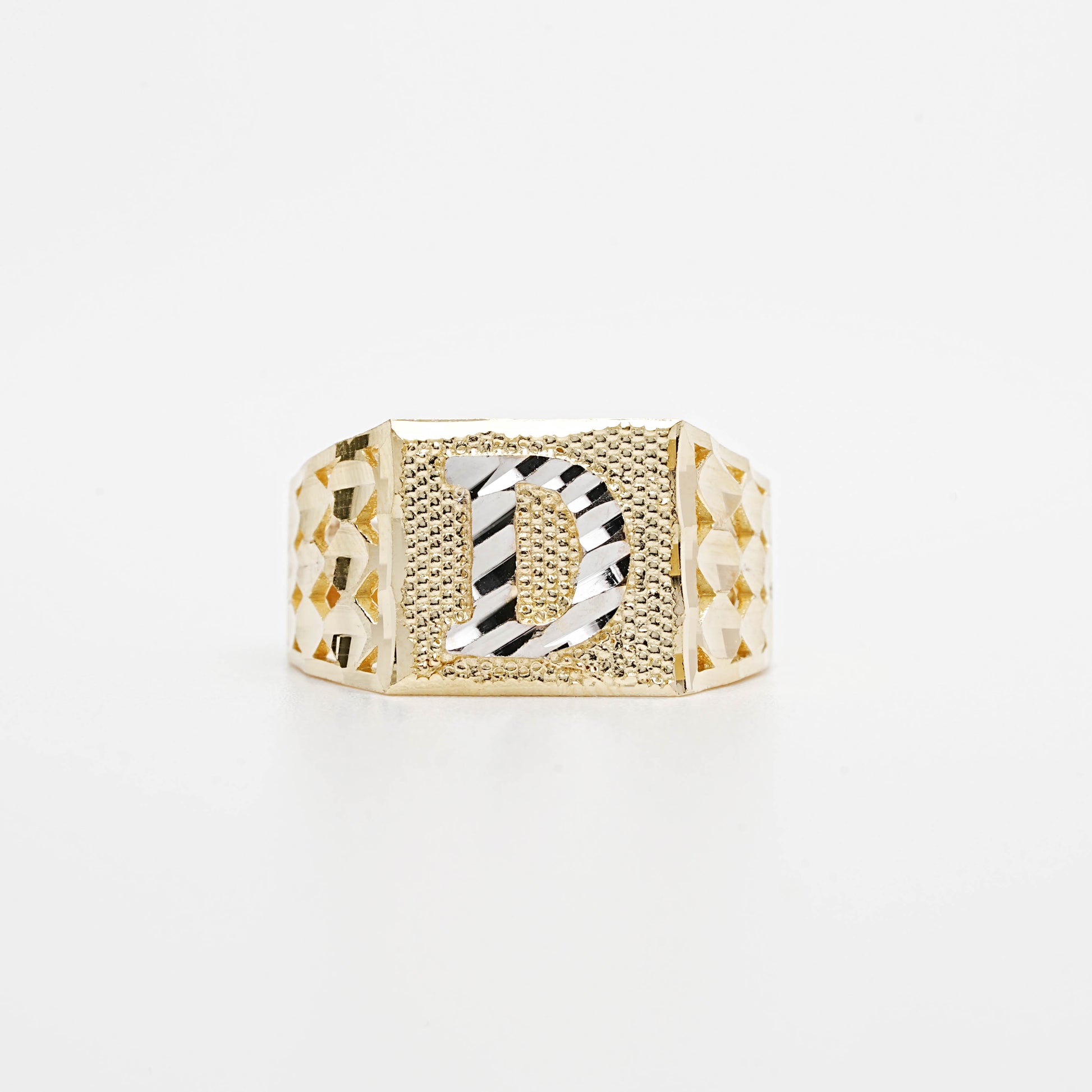This men's 10K gold ring features a striking two-tone design with a diamond-cut finish and an engraved initial. Perfect for adding a touch of personalized elegance to any outfit.