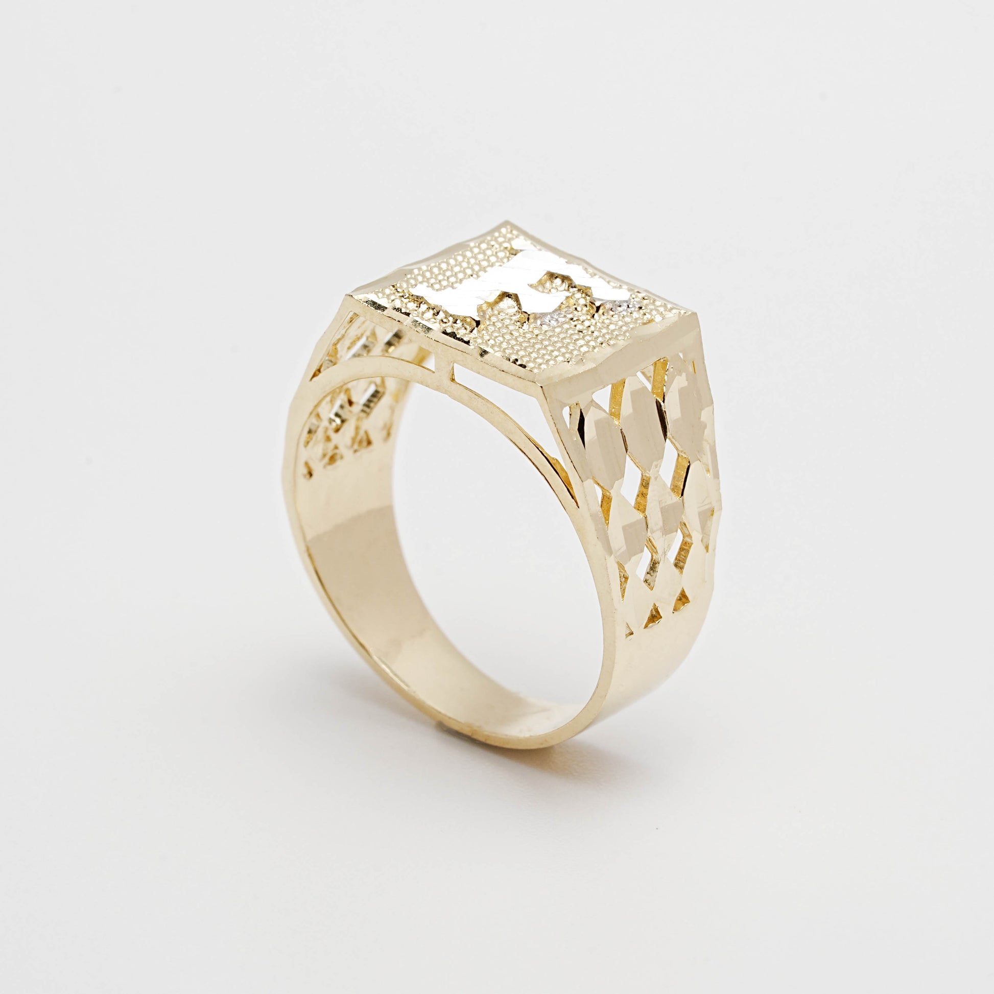 This men's 10K gold ring features a striking two-tone design with a diamond-cut finish and an engraved initial. Perfect for adding a touch of personalized elegance to any outfit.