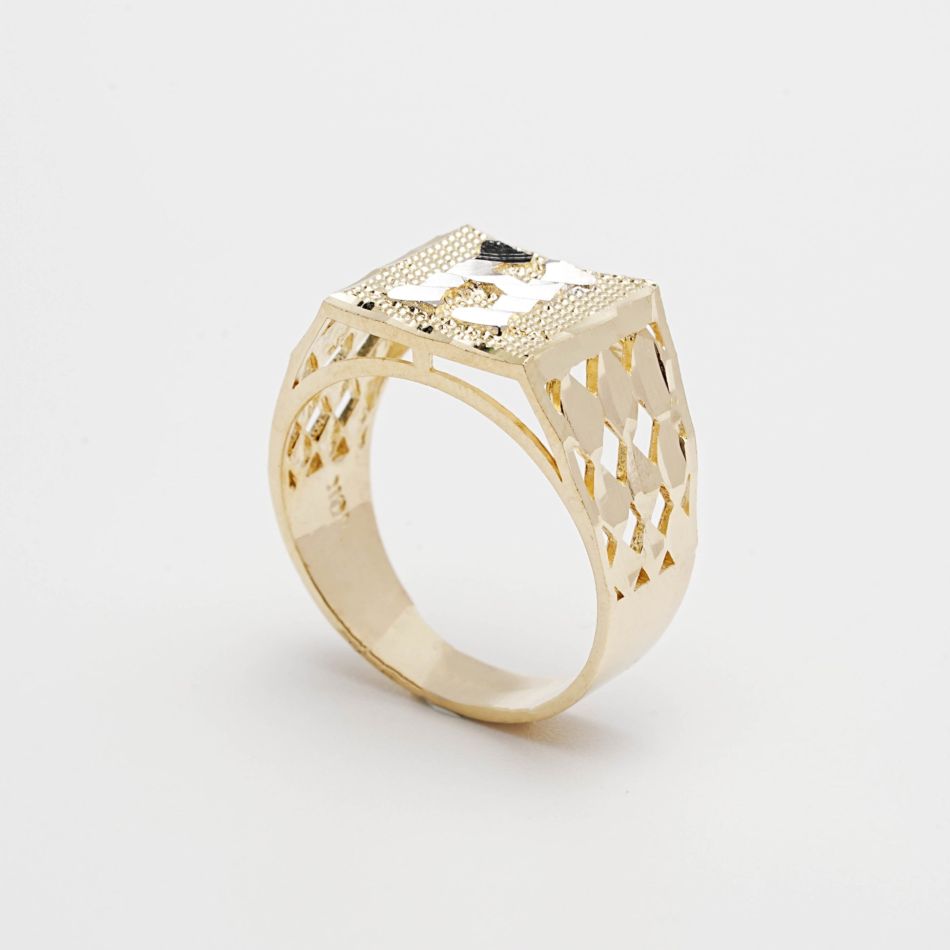 This men's 10K gold ring features a striking two-tone design with a diamond-cut finish and an engraved initial. Perfect for adding a touch of personalized elegance to any outfit.