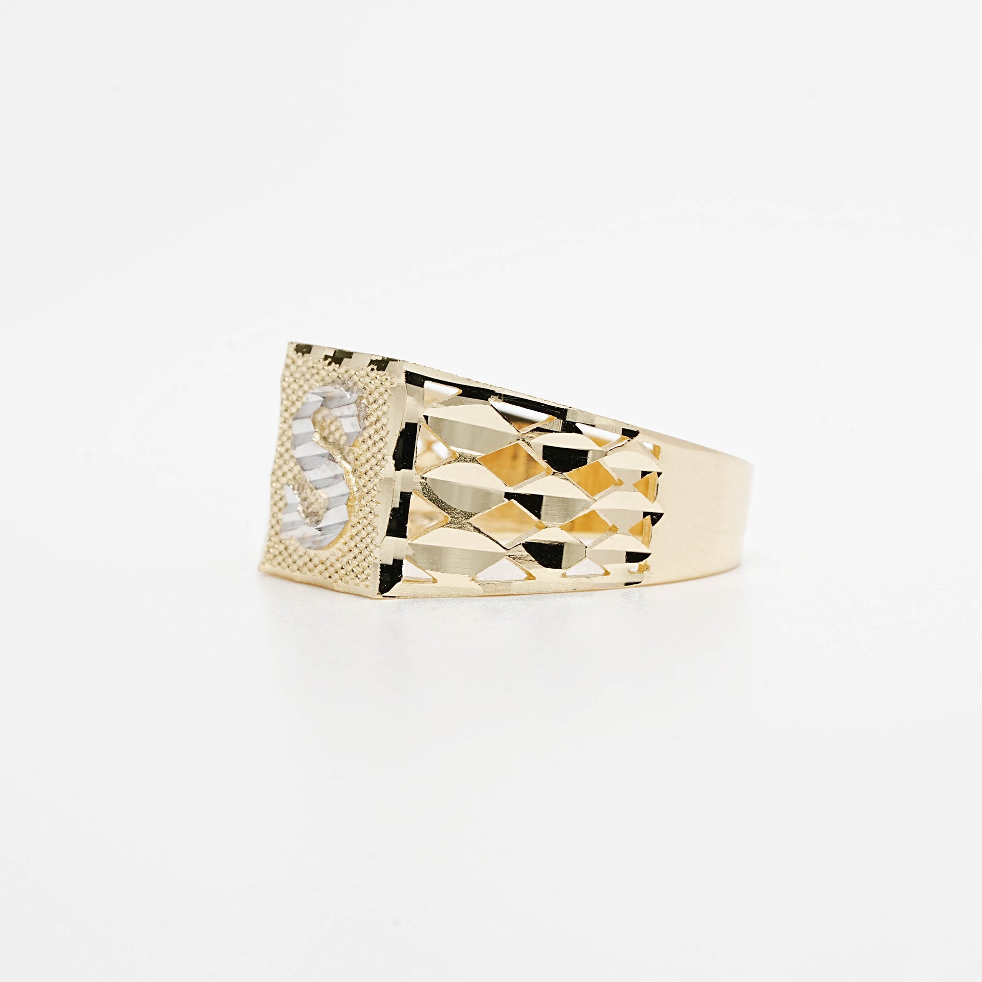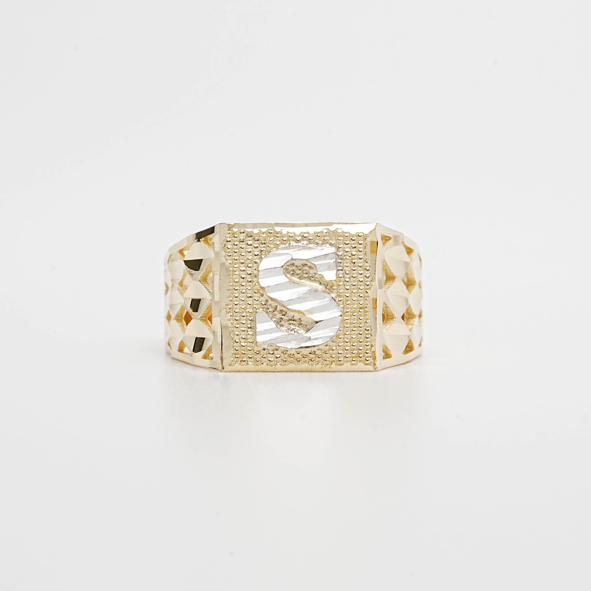 This men's 10K gold ring features a striking two-tone design with a diamond-cut finish and an engraved initial. Perfect for adding a touch of personalized elegance to any outfit.