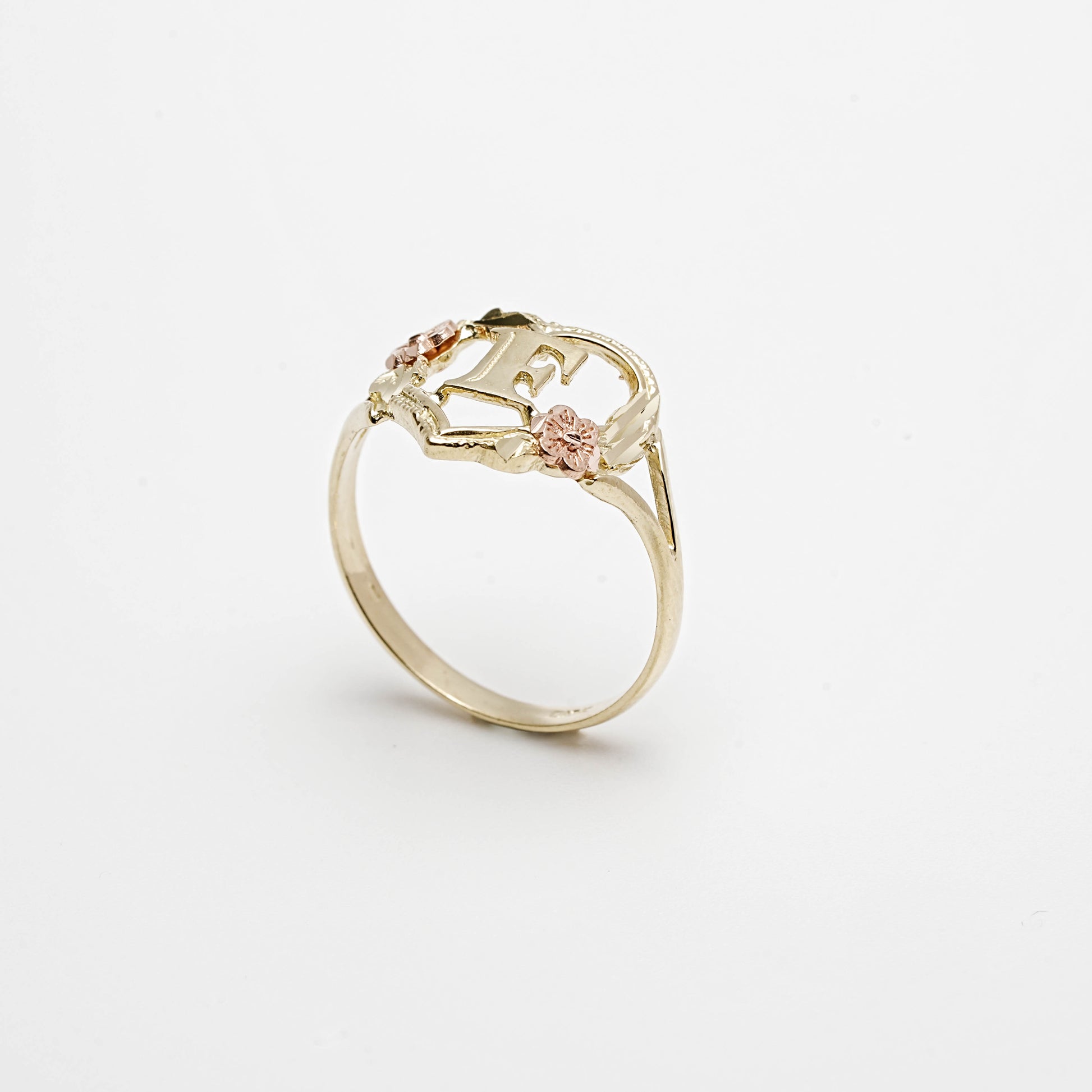 This elegant 10K two-tone ring features a delicate flower on heart design with an engraved initial. A matching necklace is also available for a coordinated look.