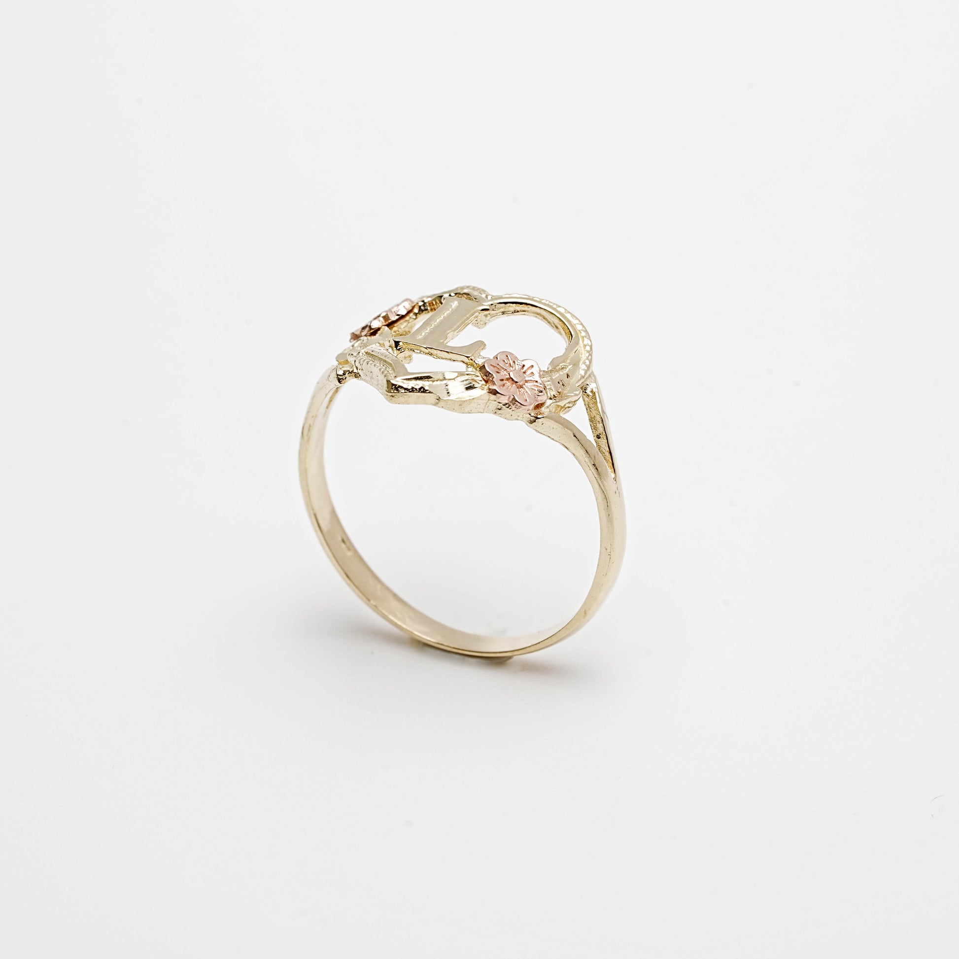 This elegant 10K two-tone ring features a delicate flower on heart design with an engraved initial. A matching necklace is also available for a coordinated look.