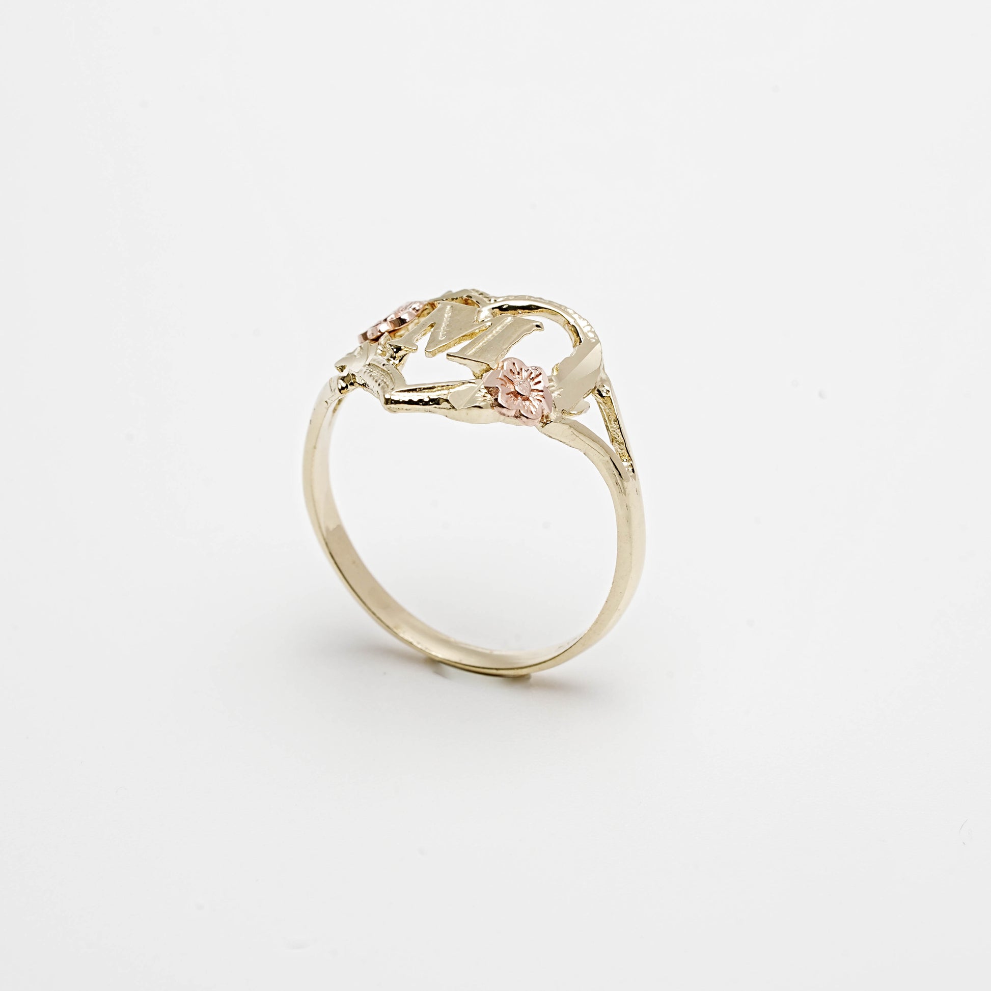 This elegant 10K two-tone ring features a delicate flower on heart design with an engraved initial. A matching necklace is also available for a coordinated look.