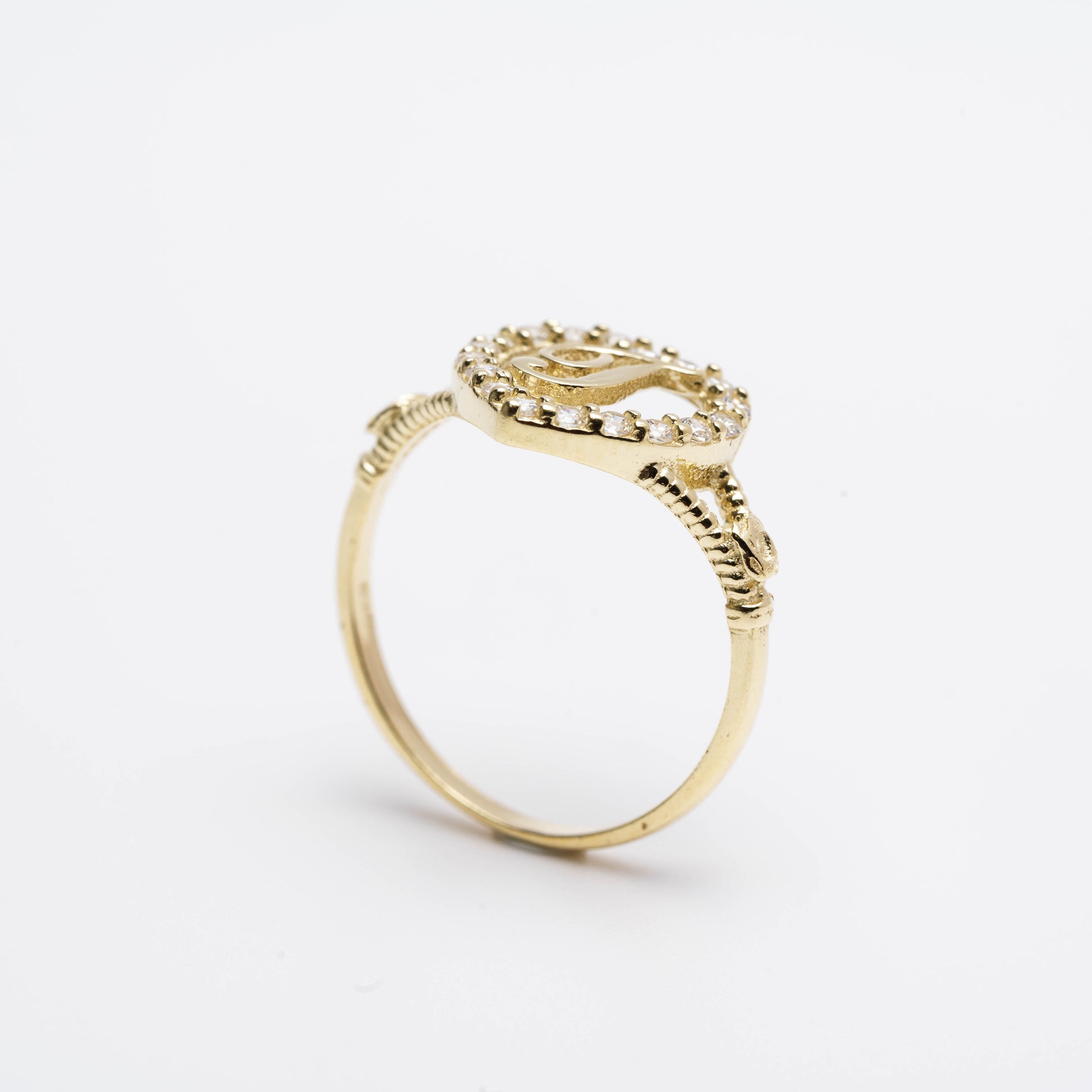 This charming ring features a beautifully engraved initial on its top, adding a personal touch. A matching initial necklace is also available for a coordinated look.