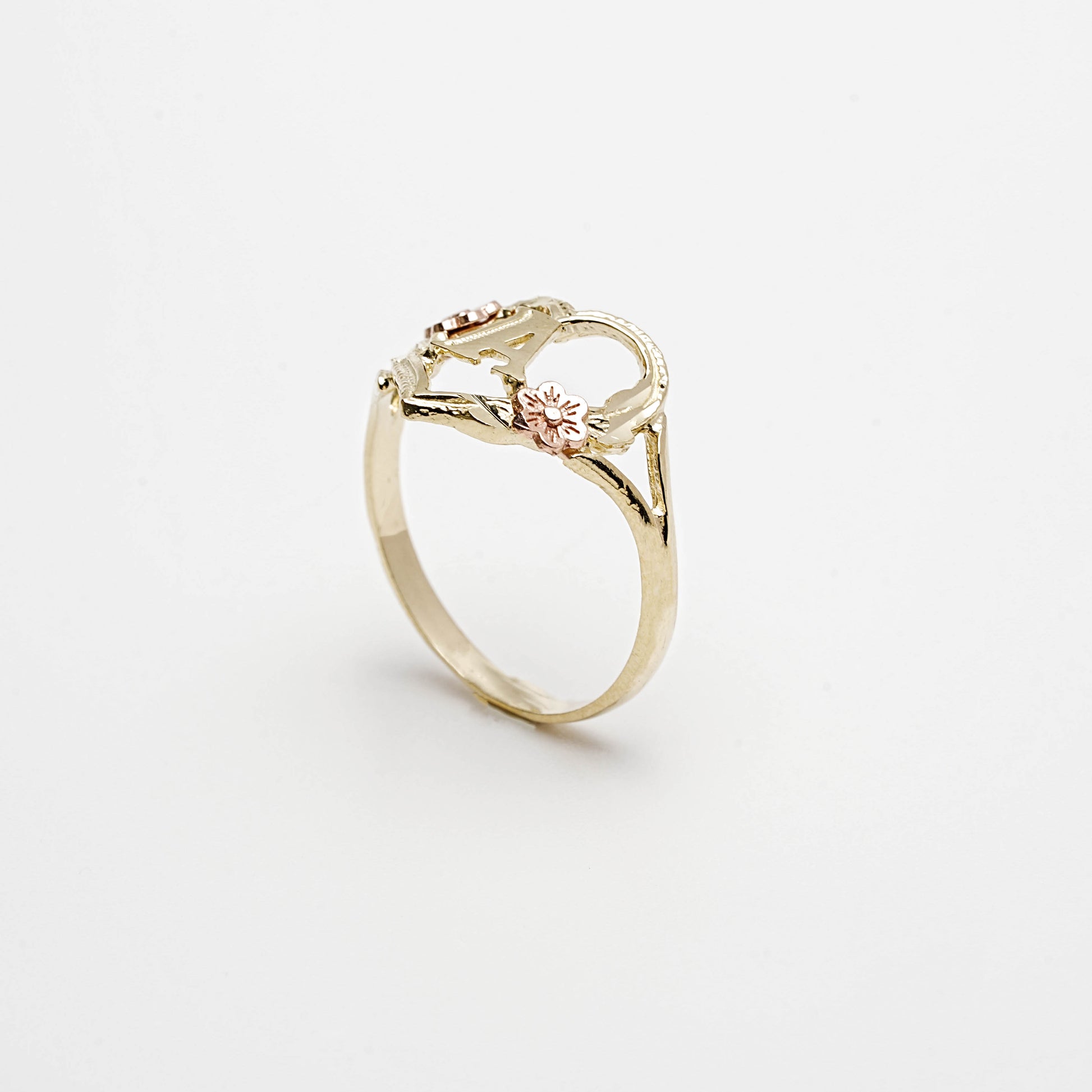 This elegant 10K two-tone ring features a delicate flower on heart design with an engraved initial. A matching necklace is also available for a coordinated look.
