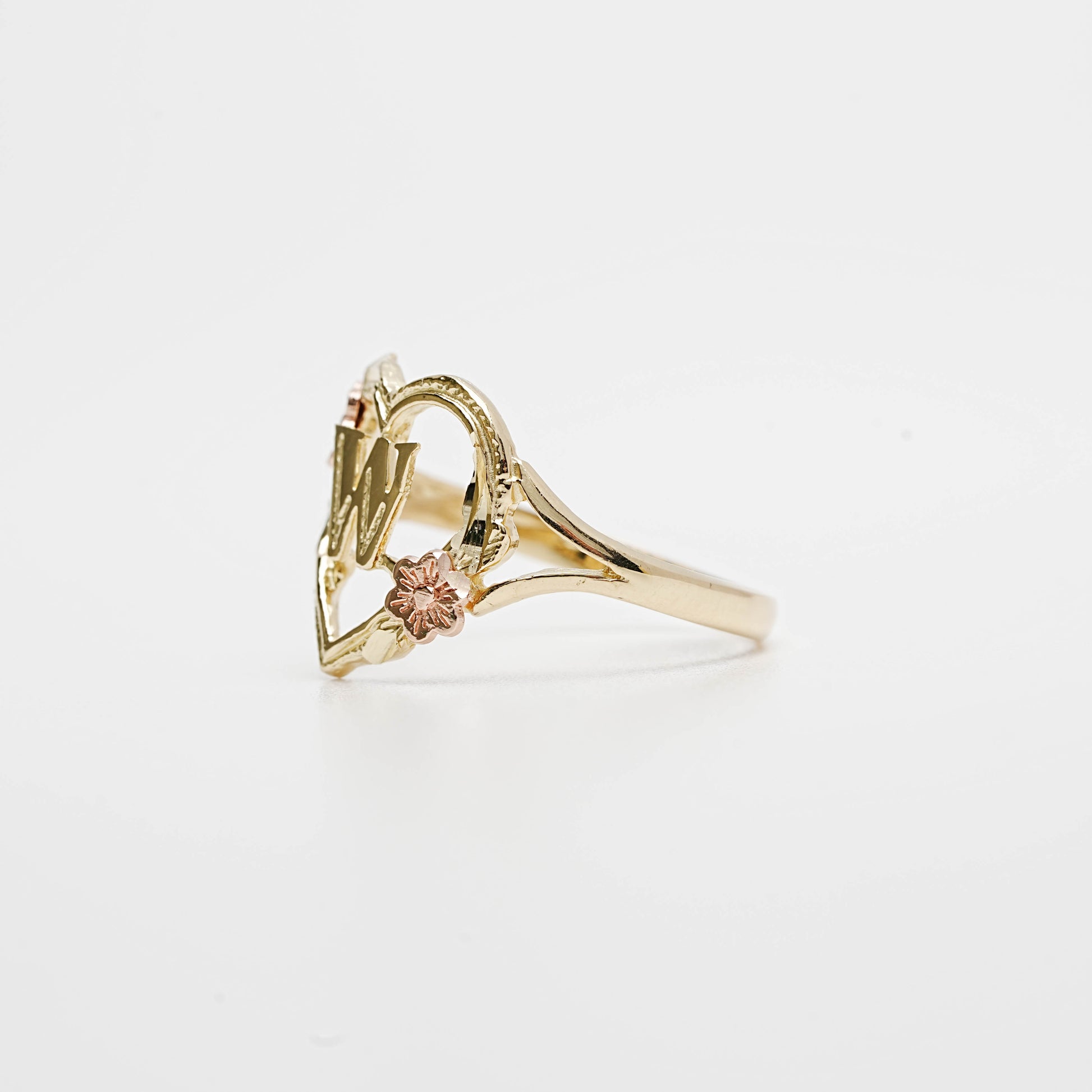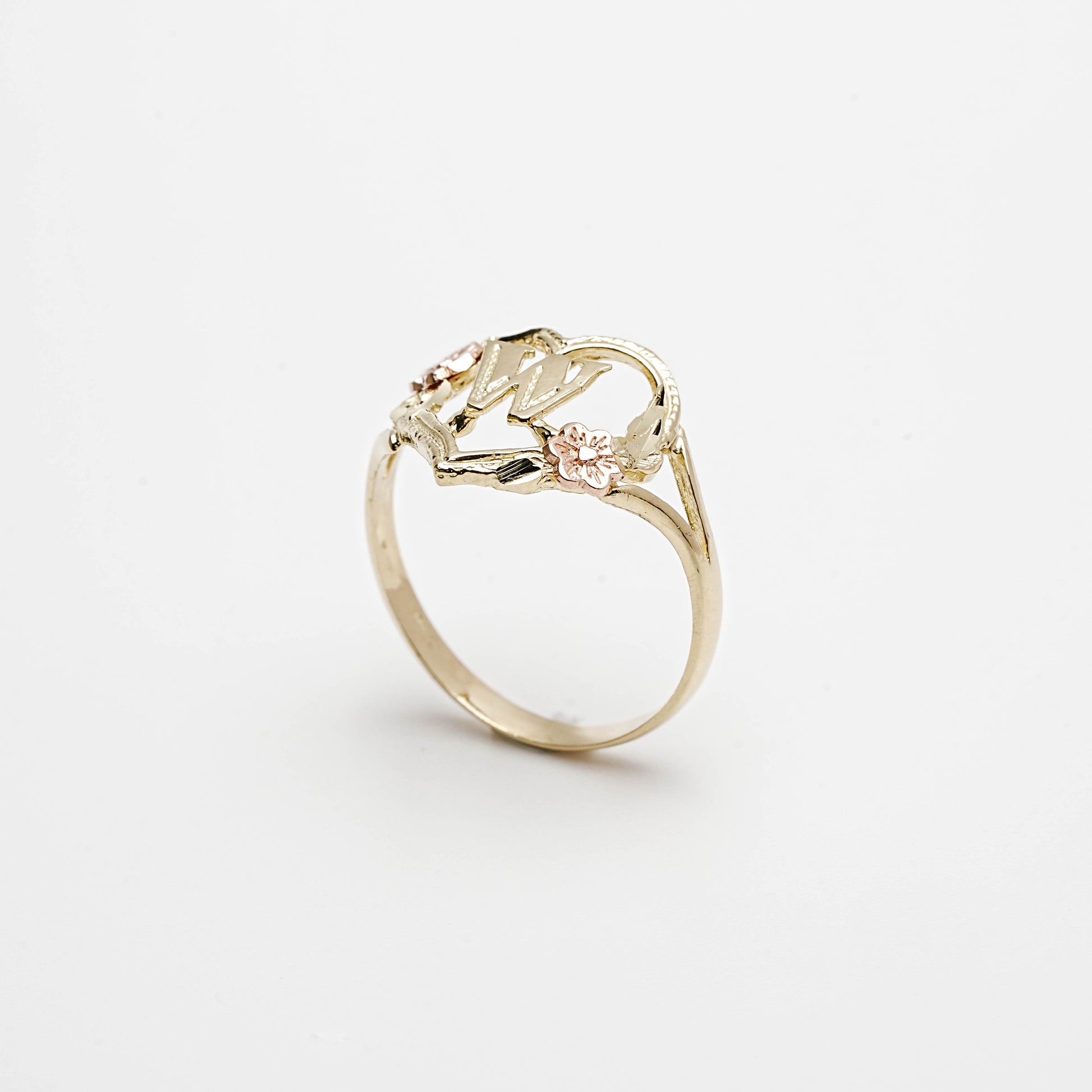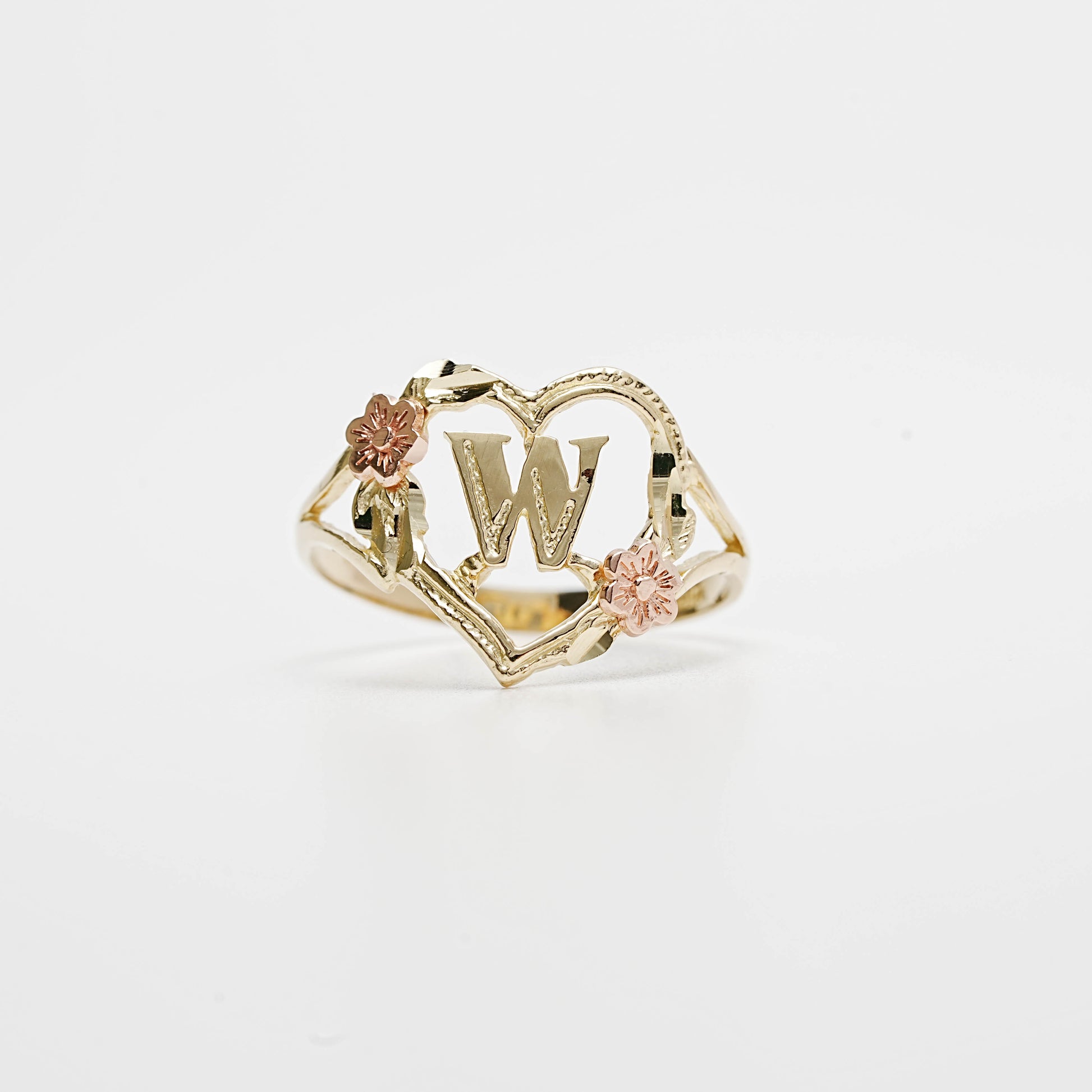 This elegant 10K two-tone ring features a delicate flower on heart design with an engraved initial. A matching necklace is also available for a coordinated look.